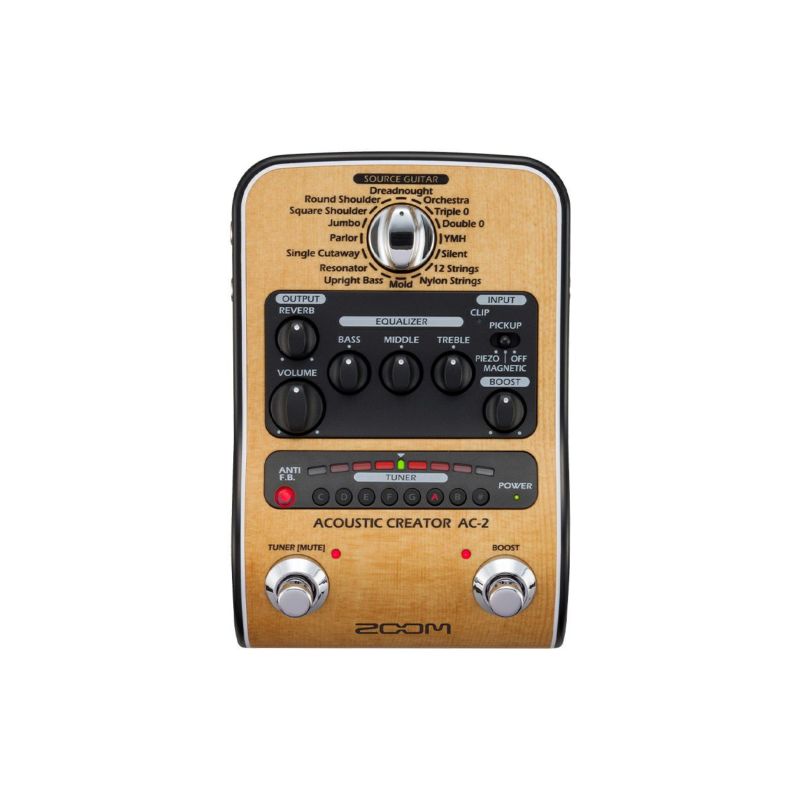 ZOOM『AC-2』は、ピックアップを通すことで失われてしまうアコースティックギターの自然なボディ鳴りを再現する「アコースティック・リモデリング」機能を搭載した、DI機能付きの高品位プリアンプ。 まるでマイクを立てたかのようなエアー感で、アコースティック楽器本来の瑞々しく繊細な鳴りを、ライブ会場のオーディエンスに届けることができます。